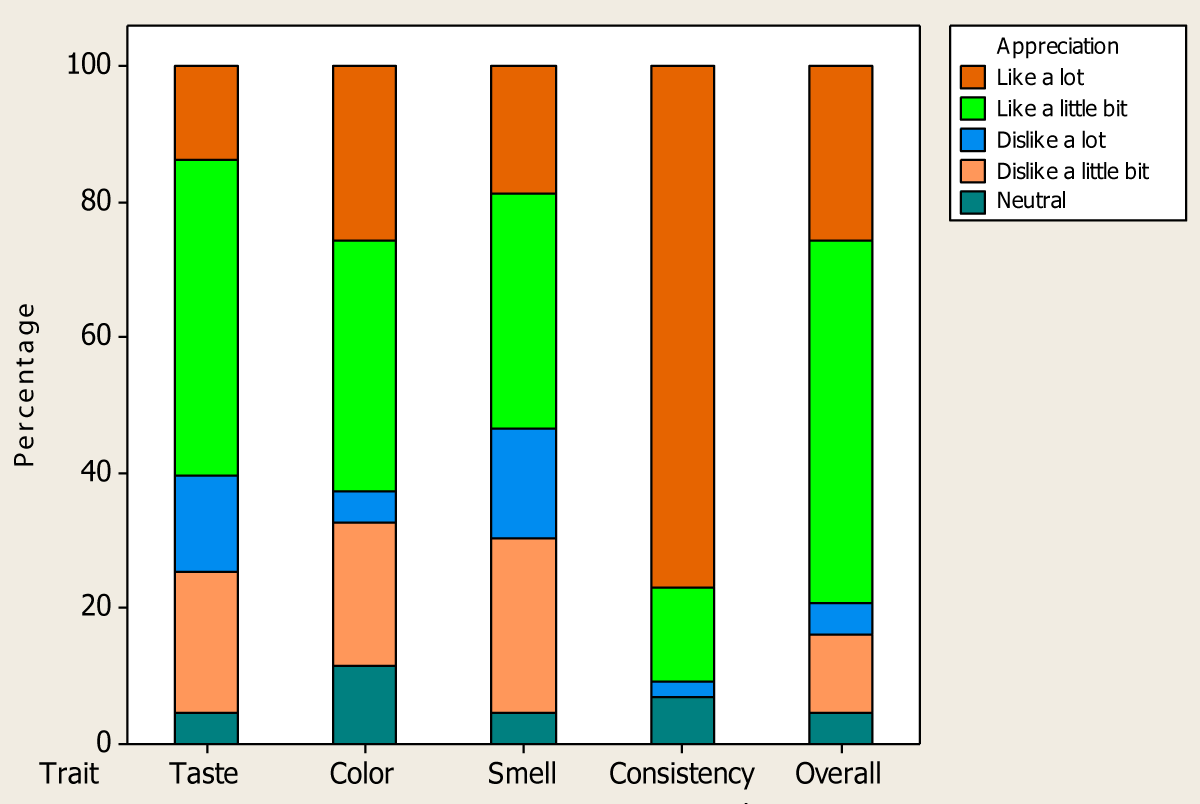 Mothers and children carried out a hedonic test on the MOL-flour-based porridge in order to determine the degree of acceptability. A panel of mothers with at least one child, different from those who participated in the experiment, was asked to evaluate the porridge. A 5-step scale, ranging from 1 (Dislike a lot) to 5 (Like a lot) was used to assess the consistency, color, and taste of the porridge. The children’s facial expression was also noted upon tasting [35].